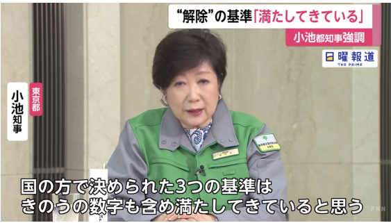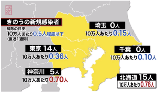東京都小池已于24日晚公布:東京都已符合解封標(biāo)準(zhǔn)。此外,首都圈內(nèi)的神奈川縣雖未能達(dá)到每10萬人0.5以下的條件,但因感染路徑可排查,醫(yī)療資源尚足的緣故,也將一并解封。