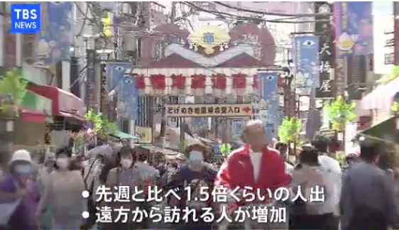 得知解封的消息后,日本街頭的人流量顯而易見地增長。巣鴨商店街的人流量比上周同期增加了1.5倍。