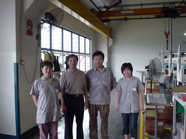 代表取締役陳一良とプラスチック加工労働者、シンガーポールにて